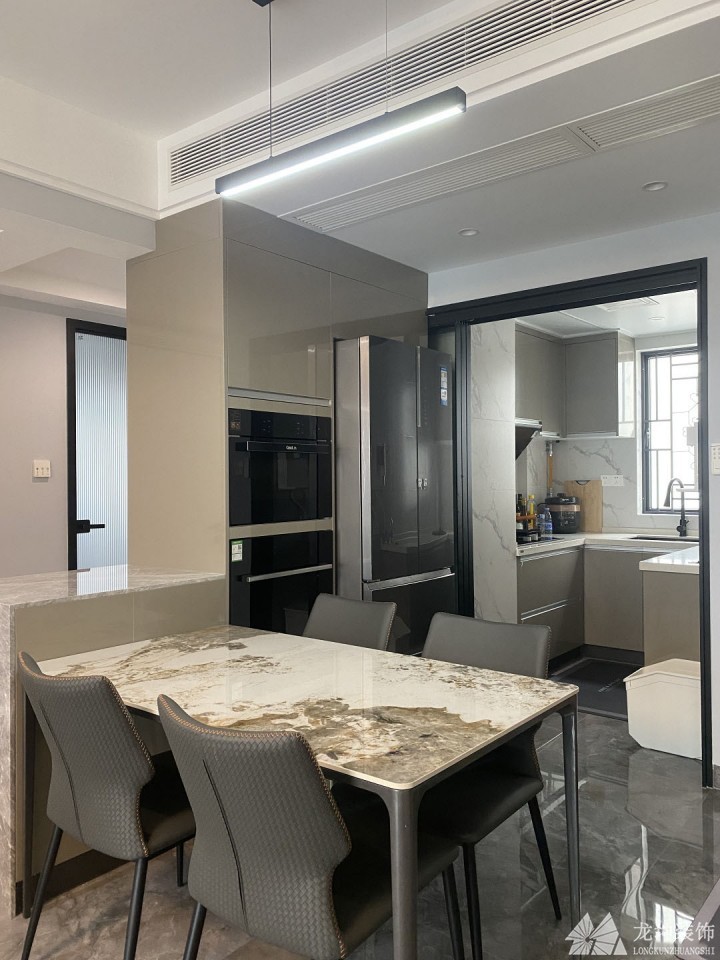 餐廳與廚房連接,大理石臺(tái)面與簡約的線條燈展現(xiàn)出不復(fù)雜卻又精致的美感。