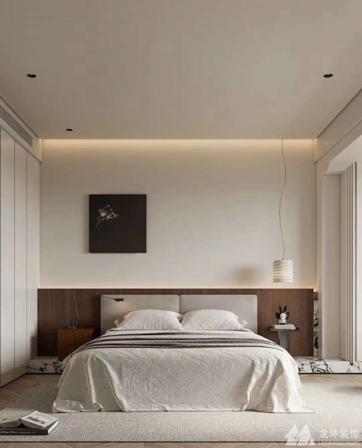 2、床頭用木飾面+格柵,空白處又設(shè)計了一小條燈帶,多采用留白美~從墻面延伸出來當做床頭柜,簡潔又好看!
